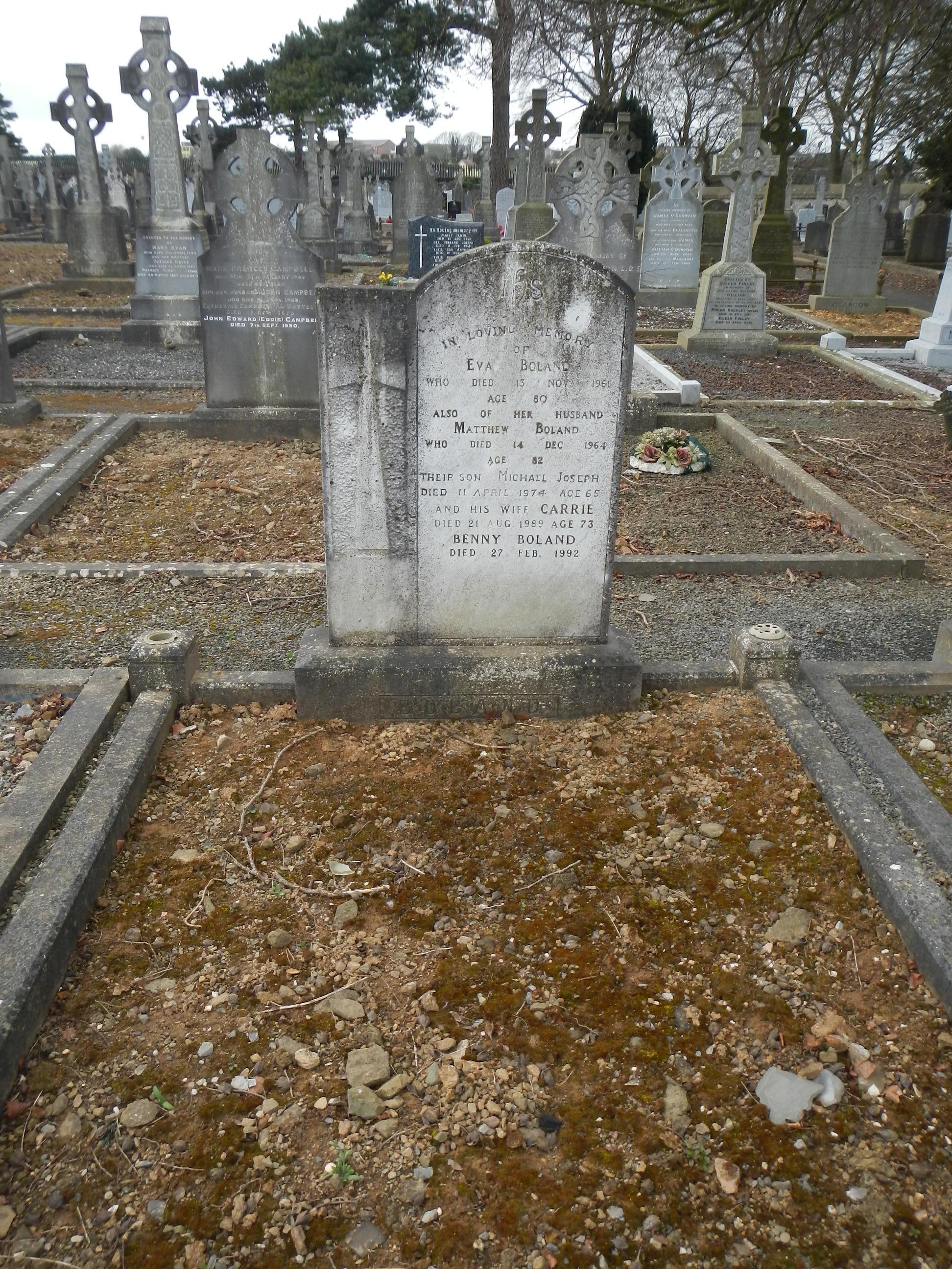 IN LOVING MEMORY/ OF/ EVA BOLAND/ WHO DIED 13 NOV 1961/ AGE 80/ ALSO OF HER HUSBAND/ MATTHEW BOLAND/ WHO DIED 14 DEC 1964/ AGE 82/ THEIR SON MICHAEL JOSEPH/ DIED 11 APRIL 1974 AGE 65/ AND HIS WIFE CARRIE/ DIED 21 AUG 1989 AGE 73/ BENNY BOLAND/ DIED 27. FEB 1992